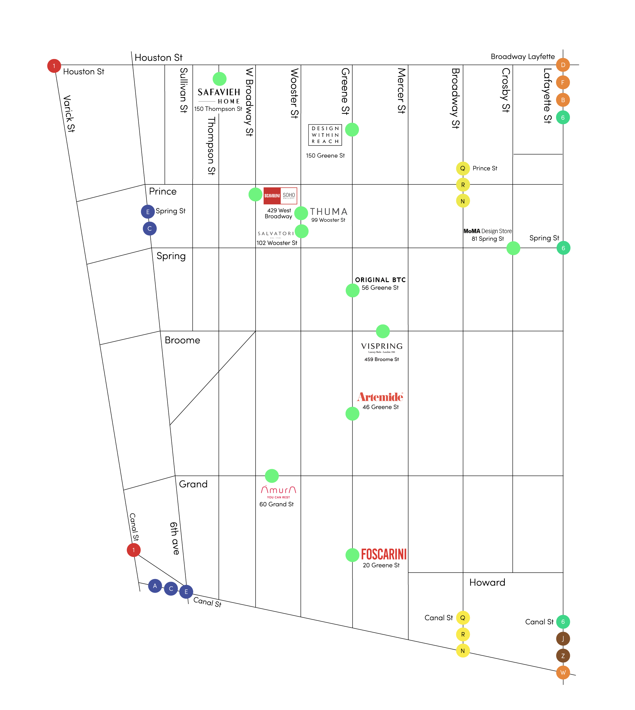 Browse the cobblestone streets of SoHo and visit our members, highlighted in the map below.