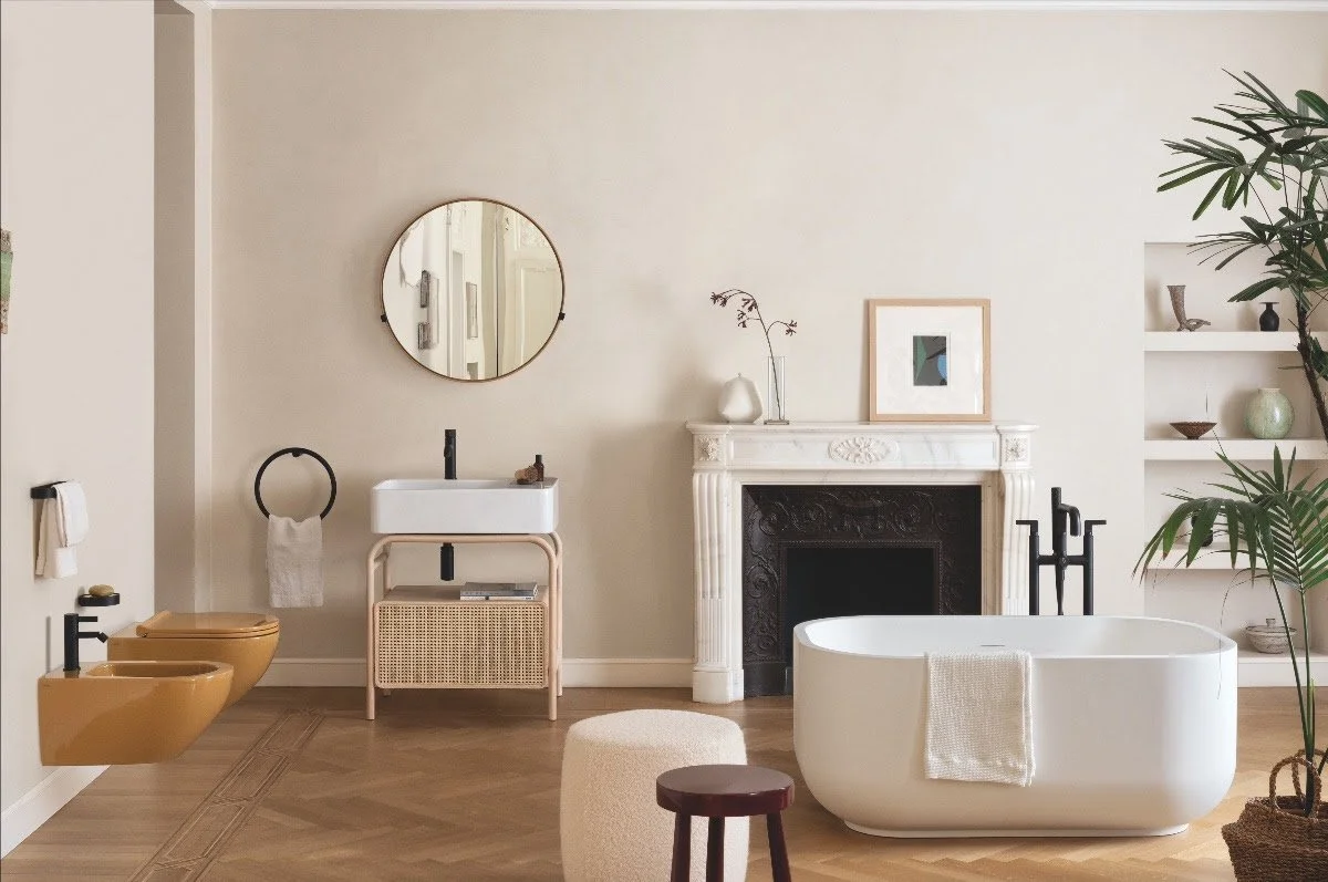 Salvatori introduces Small Hours, a new bathroom collection by Patricia Urquiola, soon debuting in NYC. This collection blends natural stone with diverse materials, embodies functionality, geometry, and color. Inspired by the serene moments of daybreak, it transforms the bathroom into a sophisticated sanctuary for the mind, body, and soul. The collection includes wall-hung, countertop, and freestanding sink basins, a mosaic pattern, a round bathtub, and customizable mirrors. Floating shelves in steel, wood, and natural stone, along with a walnut stool, enhance the bathroom's role as a holistic, personalized living space.